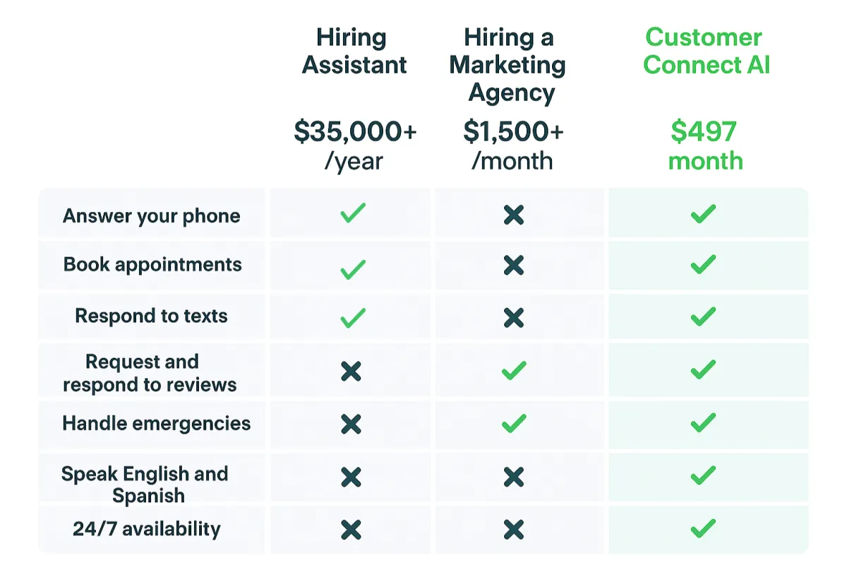 A full-time employee can cost $35k–$50k/year. With Customer Connect AI, you get 24/7 coverage, instant response to every call and text, automated reminders, and professional reputation management — at a fraction of the cost. Plus, our AI never takes a sick day